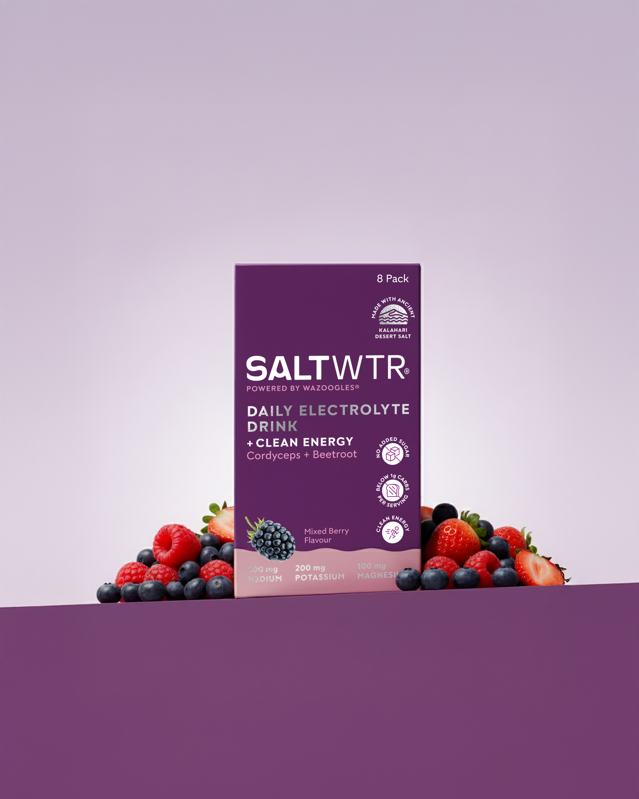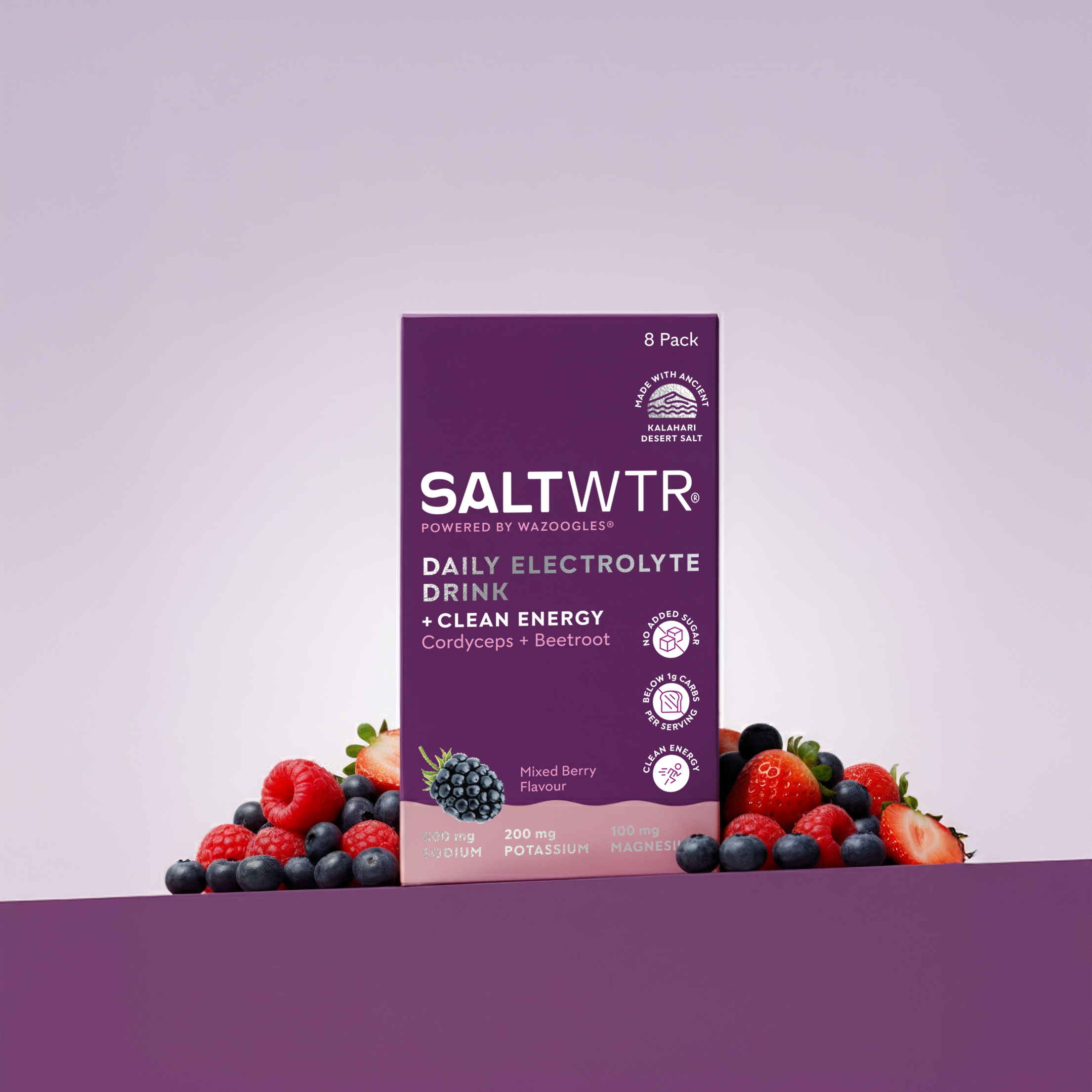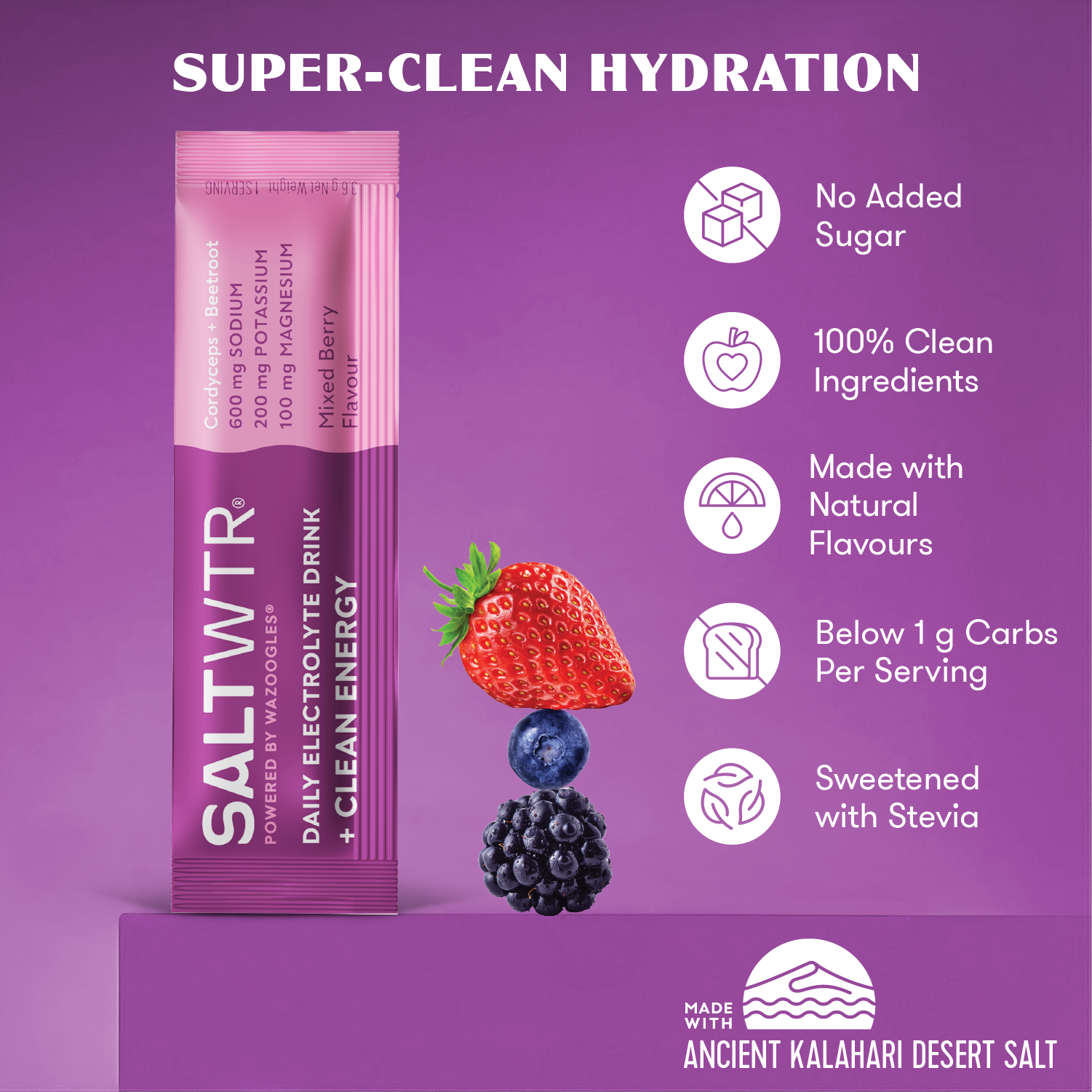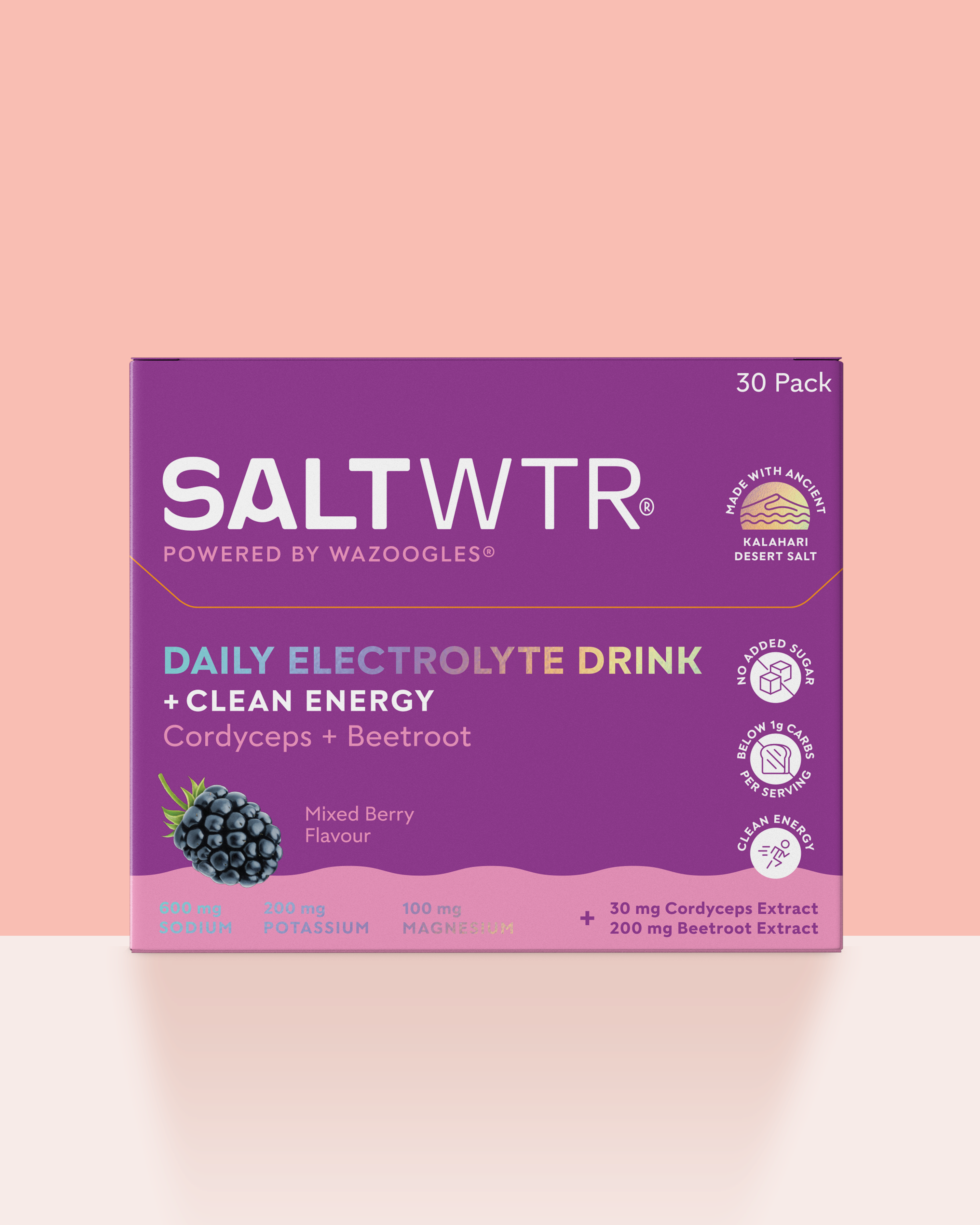 SaltWTR uses 100% clean ingredients, African Kalahari Desert Salt, contains no added sugar, and includes functional nutrition like probiotics, adaptogens, and plant extracts. It’s low-carb (<1g), keto-friendly, and only sweetened with stevia.