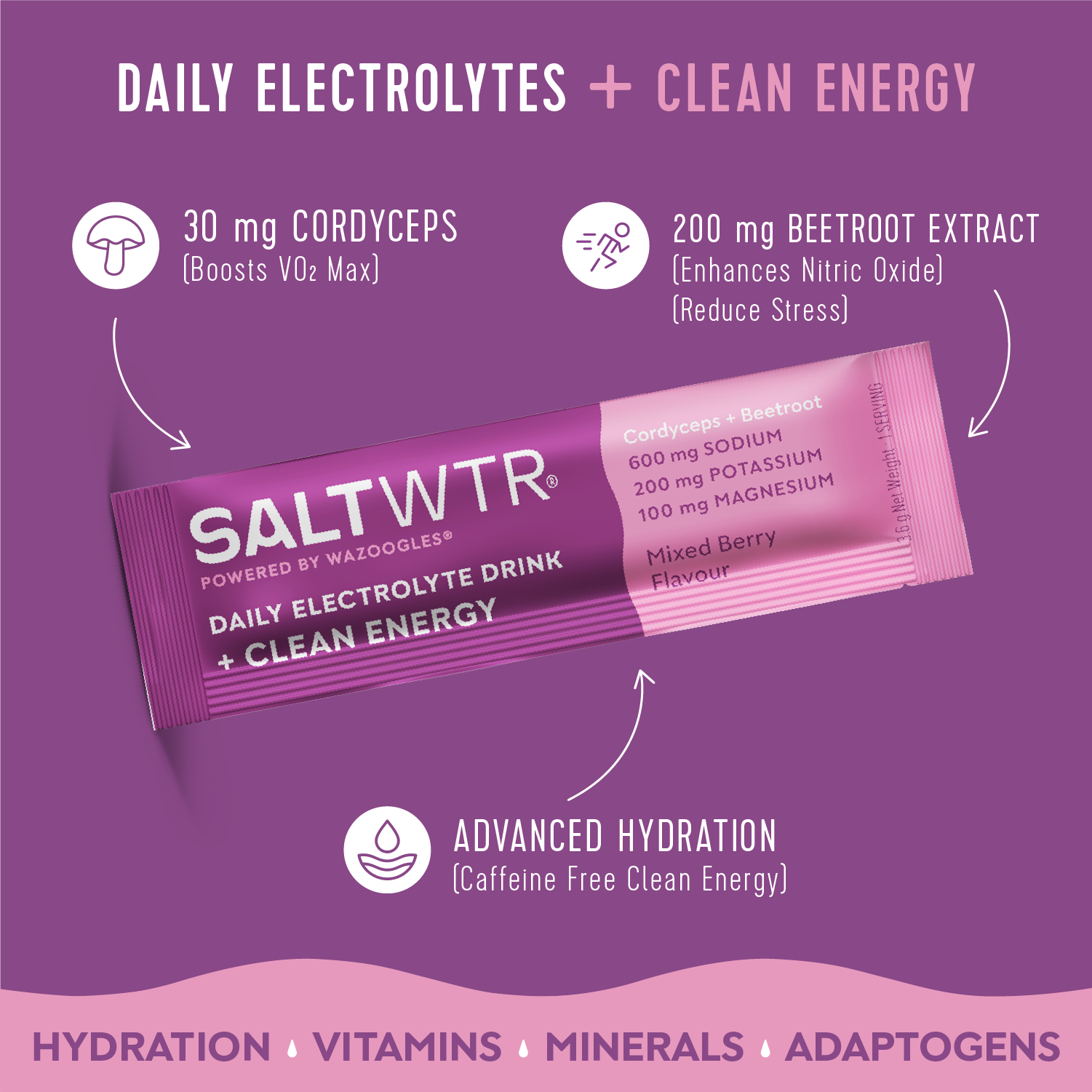 SaltWTR is an advanced hydration and nourishment solution that combines clean electrolytes, functional nutrition, vitamins, minerals, plant extracts, probiotics, and adaptogens. It's perfect for hydration, recovery, immune support, energy, and