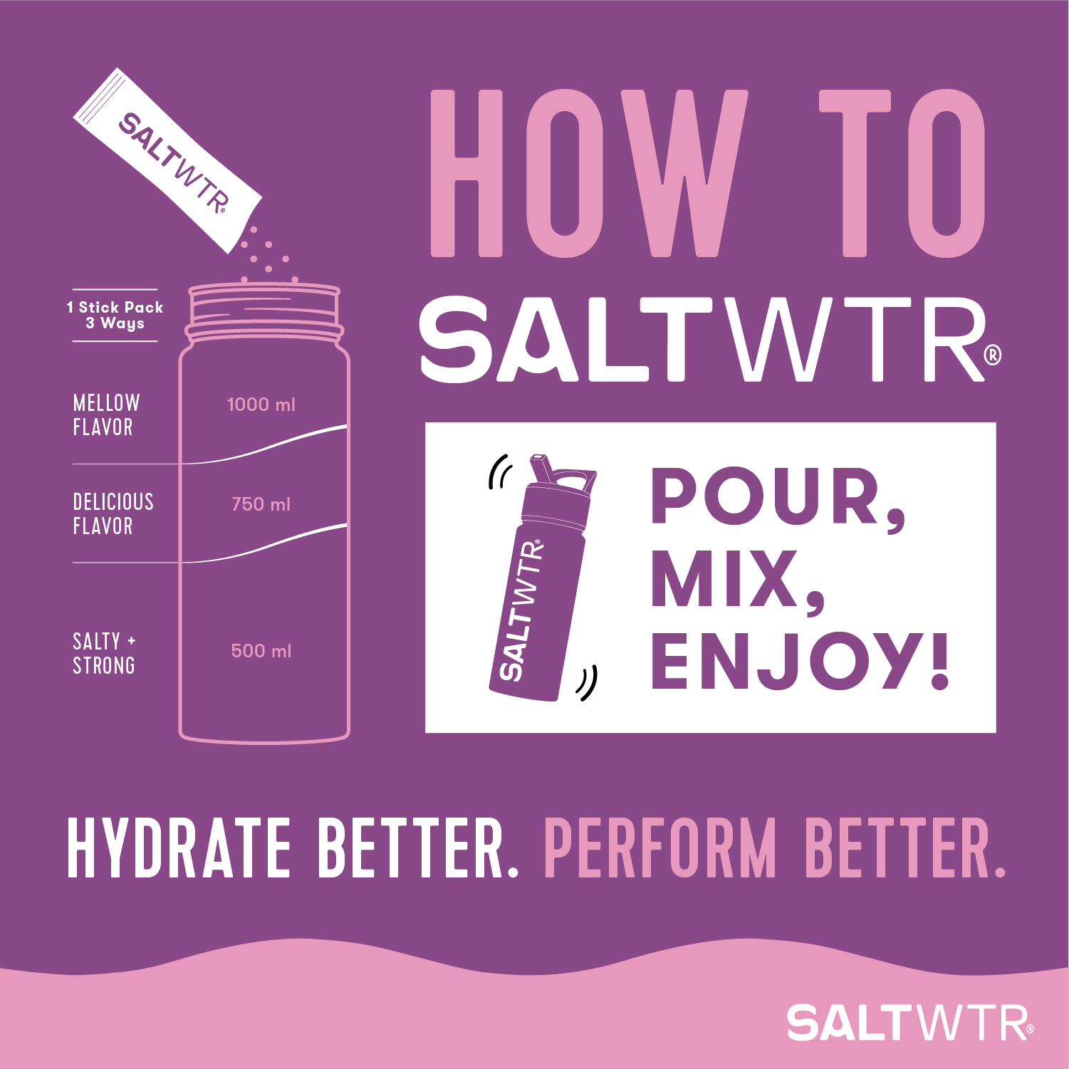 Simply mix one serving of SaltWTR in either 500ml, 750 ml or 1L, shake/stir and enjoy.