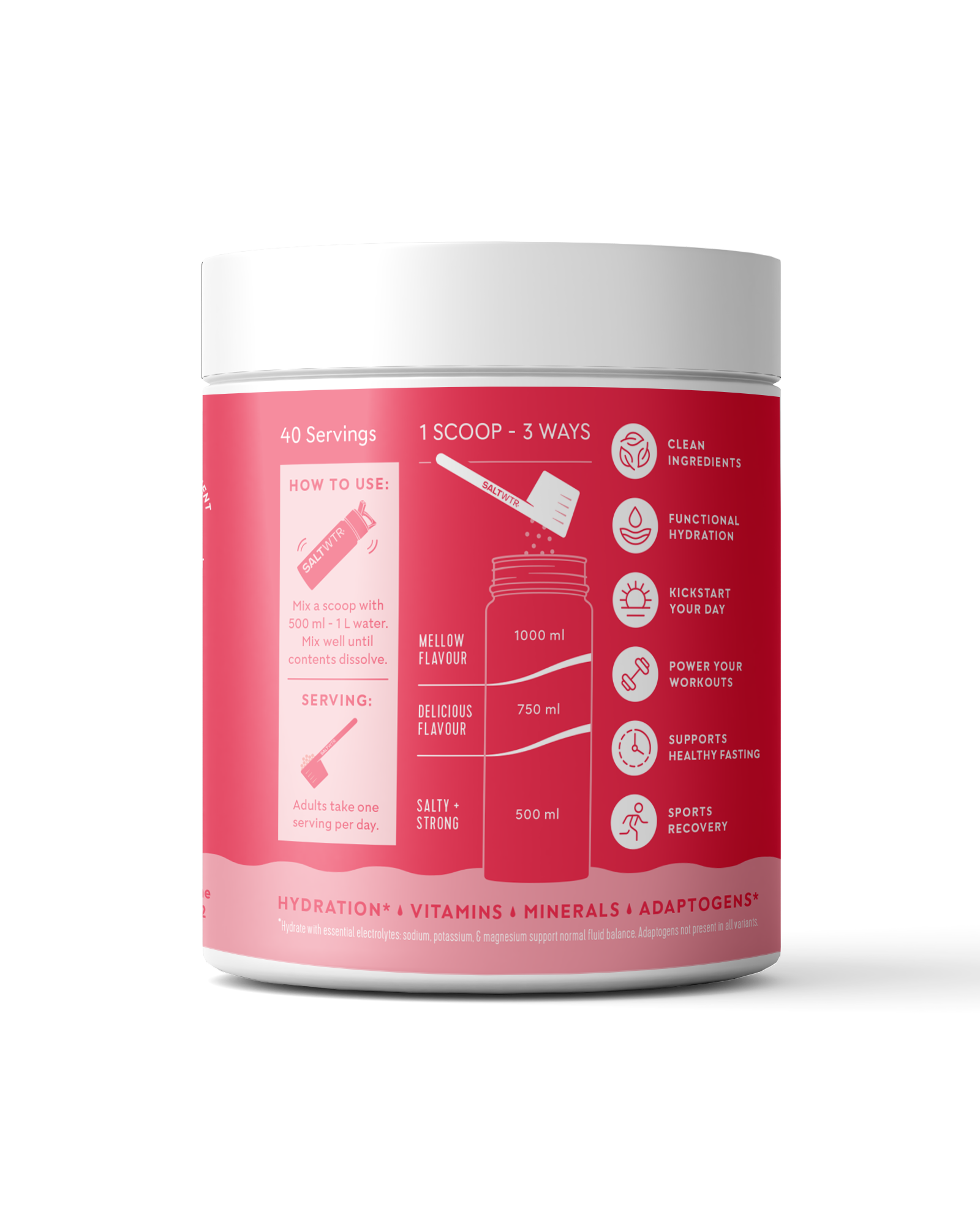 Simply mix one serving of SaltWTR in either 500ml, 750 ml or 1L, shake/stir and enjoy.