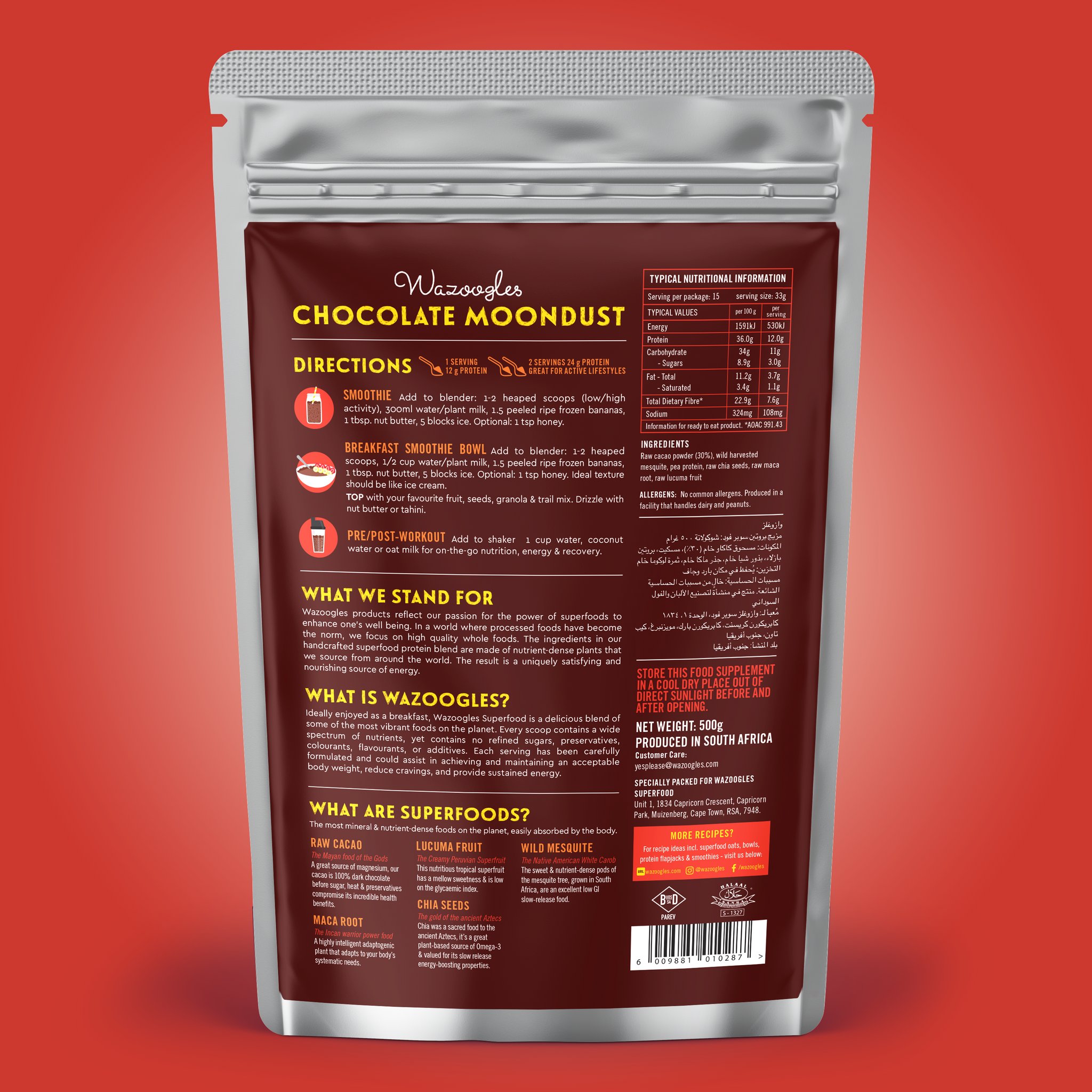 Raw cacao powder (30%), organic wild harvested mesquite*, pea protein, raw chia seeds, organic raw maca root*, organic raw lucuma fruit*. *Organic Ingredients (33%) - ZA-BIO-154. (27.1% wild harvested).
