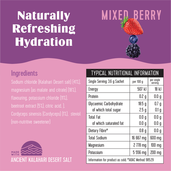 Kalahari Desert Salt is a pure, microplastic-free mineral salt, naturally rich in trace elements that help restore hydration, balance electrolytes, and support overall wellbeing.